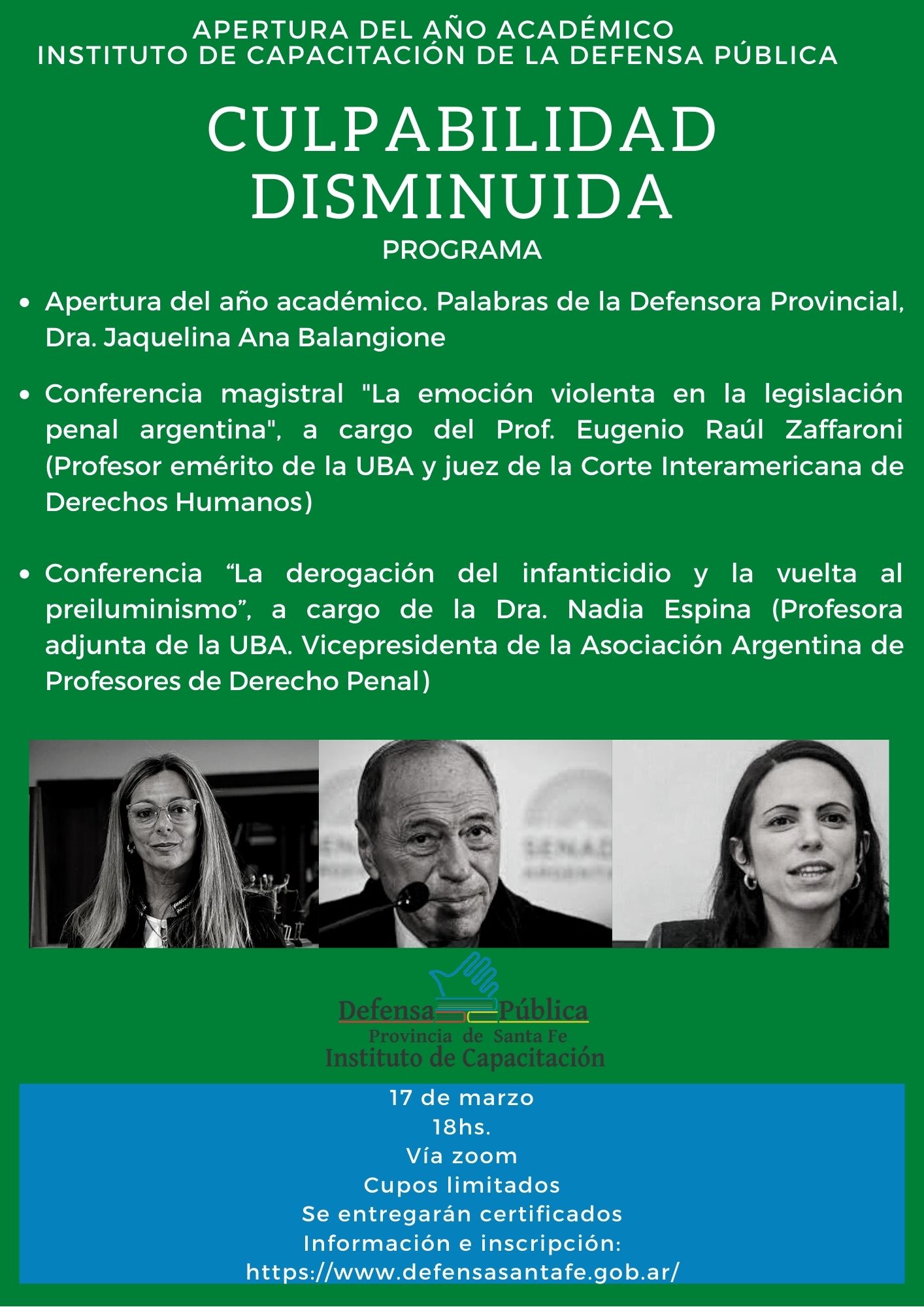 - Conferencia magistral "La emoción violenta en la legislación penal argentina", a cargo del Prof. Eugenio Raúl Zaffaroni (Profesor emérito de la UBA y juez de la Corte Interamericana de Derechos Humanos)