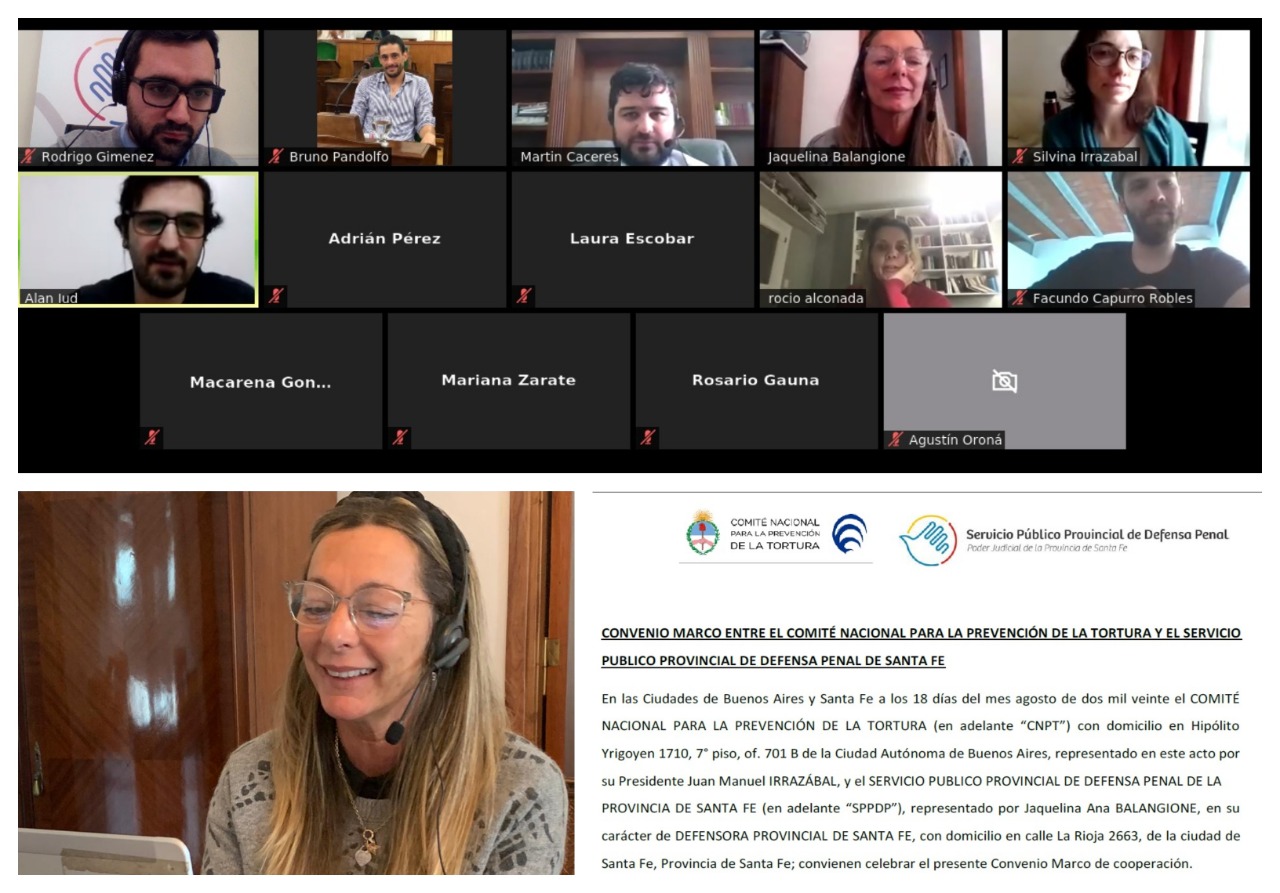 El Servicio Público Provincial de Defensa Penal -SPPDP- rubricó en el día de ayer un convenio marco de cooperación con el Comité Nacional para la Prevención de la Tortura -CNPT-, al tiempo que los integrantes de ambos organismos mantuvieron una reunión de presentación por medio de la aplicación zoom. Vale destacar que el instrumento fue suscripto por la Defensora Provincial, Dra. Jaquelina Ana Balangione; y por el Presidente del CNPT, Dr. Juan Manuel Irrazabal.